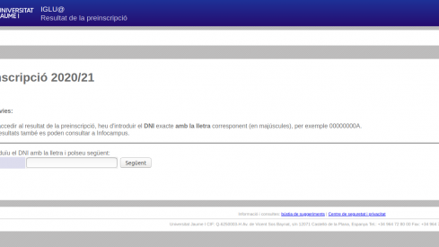 El Grau de Medicina ha sigut el que ha registrat la nota de tall més elevada, amb un 13,258. Li han seguit el Grau en Infermeria, amb un 11,729; el de Matemàtica Computacional, amb un 11,546; el Doble Grau en Administració d'Empreses i Dret, amb un 11,430; i el Grau en Traducció i Interpretació, amb un 11,226. En la resta de centres, els graus més demandats són els de Mestre/a d'Educació Primària i Mestre/a d'Educació Infantil en la Facultat de Ciències Humanes i Socials; en la Facultat de Ciències Jurídiques i Econòmiques destaca un any més el Doble Grau en Administració d'Empreses i Dret, que ha cobert les 30 places oferides i compta amb una de les notes de tall més altes, així com l'alta demanda del Grau en Criminologia i Seguretat. Finalment, a l'Escola Superior de Tecnologia i Ciències Experimentals, els més sol·licitats han sigut el Grau en Disseny i Desenvolupament de Videojocs i el Grau en Enginyeria Informàtica. NotasCorte2020 Per a iniciar la preinscripció al grau de la universitat, serà necessari introduir el DNI en la plataforma IGLU o consultar els resultats en Infocampus, com es mostra en la imatge: