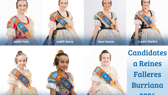 Esta vesprada, en les oficines de Junta Local Fallera, una vegada conclòs el termini per a presentar estes candidatures, s'ha revelat el nom de les 3 xiquetes i 4 jóvens que desitgen representar a Burriana en les pròximes Falles de 2026. Judith Felis Canut de la Falla Barri La Vila, Judith Serra Domingo de la Falla Societat Cardenal Tarancón, Sara García Serrano de la Falla Barri València i Laura Sendra Muñoz de la Falla Barri La Mercè, opten a aconseguir el títol de Reina Fallera de Burriana. Per la seua part, María José Broch Monraval de la Falla Don Bosco, Mireia Oltra Moreno de la Falla Rei Jaume I i Ana Olivas Vidal de la Falla Barri La Mercè, es disputen el lloc de Reina Fallera Infantil.