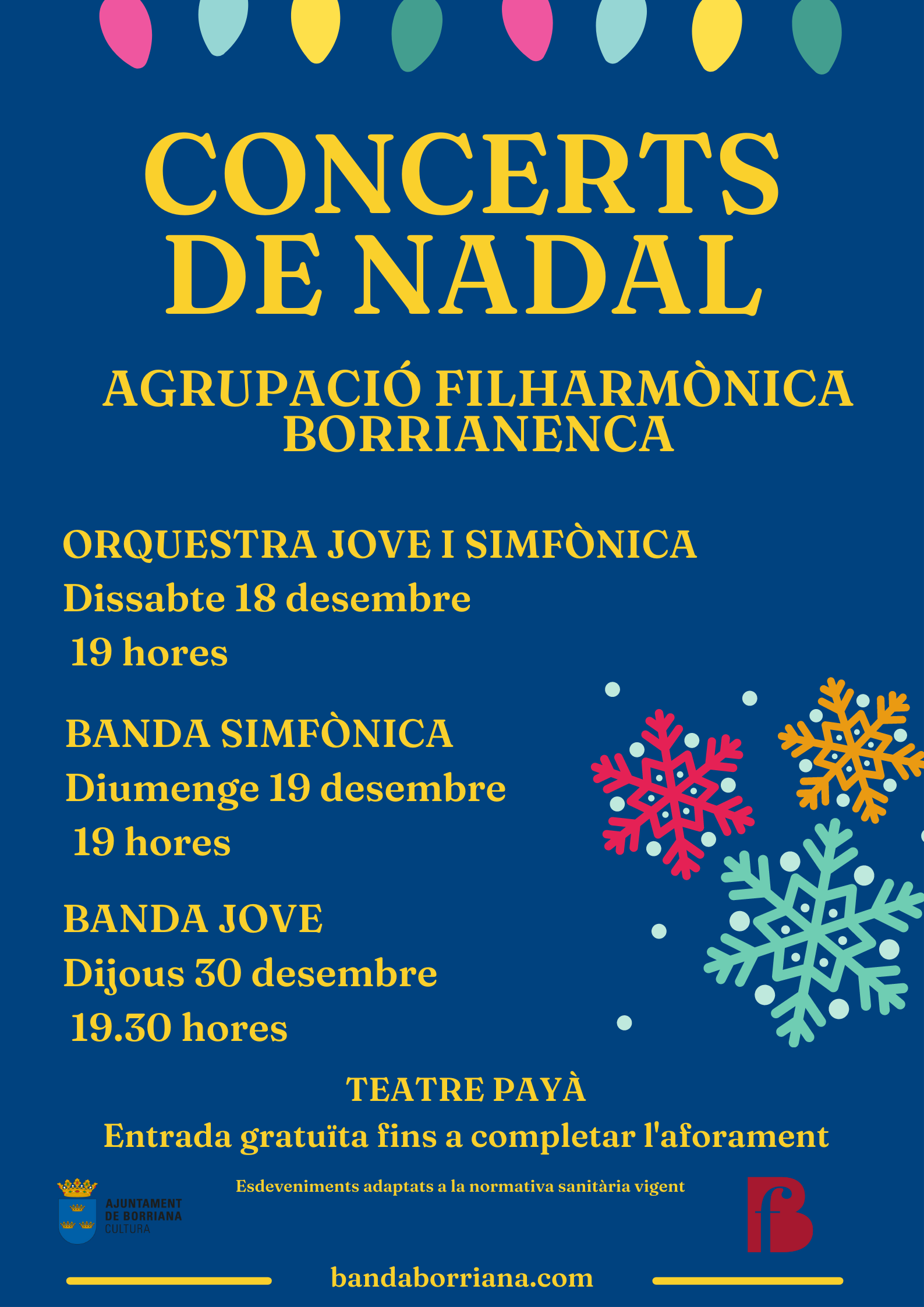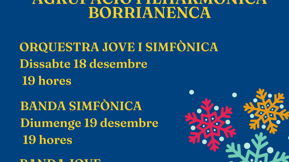 Amb l'arribada de les dates nadalenques, les entitats musicals de Borriana preparen per a aquest cap de setmana les primeres cites amb els tradicionals concerts per a donar la benvinguda al Nadal a la ciutat.Enguany les primeres formacions a pujar a l'escenari del Teatre Payà seran les orquestres Jove i Simfònica de l'Agrupació Filharmònica Borrianenca, que iniciaran el cicle d'audicions el dissabte dia 18 de desembre a les 19 hores amb el tradicional Concert de Nadal. La secció de l'Orquestra Jove, dirigida per Pedro Gilabert, obrirà el concert amb un programa divers quant als estils i compositors, seguida per l'Orquestra Simfònica sota les ordres de Victor Yusà.S'iniciarà el concert amb el primer moviment de la Simfonia del Nou Món, de Antonín Dvořák, seguint amb la famosa ària "Lascia ch'io pianga" de l'òpera Rinaldo, de Georg Friedrich Händel. Amb un canvi total de registre, la formació jove interpretarà "El Regne de Cors", de la compositora japonesa de música per a videojocs Yoko Shimomura, per a continuar amb el conegut "Himne de l'alegria" de Ludwig van Beethoven i finalitzant amb el cancan de l'opereta Orfeu als inferns de Jacques Offenbach.El diumenge dia 19 a les 12 hores serà el torn del Cor Carnevale, dirigit per José Ramon Calpe, que oferirà el seu Concert de Nadal a l'església de la Mercè. El mateix dia, a les 19 hores, la Banda Simfònica de l'Agrupació Filharmònica oferirà al Payà el seu concert nadalenc sota la direcció de Norma Comes.En aquesta ocasió el programa, sota el títol Música de dansa, estarà dedicat a obres relacionades o concebudes per a aquesta disciplina. En la primera part del concert es podran escoltar la "Dansa colorista" de Rafael Mullor Grau, seguida pel poema simfònic "Dansa macabra" de Camille Saint-Saëns amb l'arranjament de Giancarlo Gazzani, i la primera part acabarà amb les danses guerreres de l'òpera El príncep Igor de Borodin amb l'arranjament de José Manuel Izquierdo.Per a la segona part, la banda simfònica interpretarà la "Dansa oriental" d'Izquierdo, la "Dansa bacanal" de l'òpera de Samsó i Dalila de Saint-Saëns amb l'arranjament Jay Bocook, i finalitzarà amb la suite del ballet El Llac dels cignes de Txaikovski, amb l'arranjament de Daniel Martín.Tancarà el cicle la Banda Jove de l'Agrupació el 30 de desembre a les 19.30 hores al Payà. Tots els concerts seran gratuïts, amb entrada lliure fins a completar l'aforament, i estaran subjectes i adaptats a la normativa sanitària vigent.