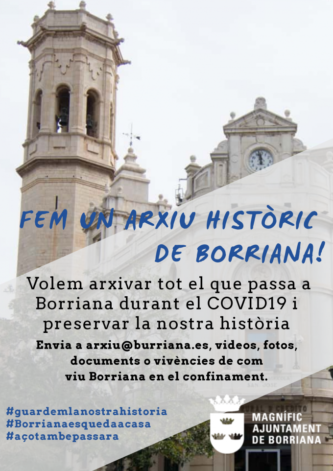 L'Ajuntament de Borriana ha llançat una campanya per a crear un arxiu que arreplegue tot el que haja passat i el que s'haja viscut a la ciutat durant el confinament pel Covid-19.L'objectiu, segons ha explicat el regidor de Cultura, Vicent Granel, passa per contar amb fotografies, vídeos, documents i fins i tot testimoniatges, “un període de temps rellevant en la nostra societat, i guardar informació del que ha passat, passa i passarà a la nostra ciutat”.Granel ha manifestat que “tots som conscients de la greu situació actual que estem vivint a causa de la pandèmia de coronavirus, una situació que passarà a ser històrica i que l'Arxiu Municipal està treballant per conservar i documentar”.Per això, l'Ajuntament de Borriana anima la ciutadania del municipi a participar en la recollida i preservació d'evidències sobre els efectes socials del Covid-19, i que cedisca a l'Arxiu Municipal els testimoniatges més rellevants de la seua experiència.Tal com ha exposat Granel, es tracta de “compartir tot tipus de documents en forma de textos, vídeos, àudios, dibuixos o fotografies, amb l'objectiu de crear un fons documental que relate com va viure Borriana l'estat d'alarma, el confinament i la crisi provocada pel Covid-19”.Un fons documental que inclouria experiències personals, familiars, de l'àmbit laboral, imatges de la ciutat amb els carrers buits, dibuixos infantils, cartells de comerços i empreses, iniciatives que mostren la solidaritat entre veïns, homenatges al personal sanitari, entre d'altres.Les persones interessades poden enviar tot el material que creguen oportú per correu electrònic a arxiu@burriana.es en forma de fitxer adjunt o fent servir serveis gratuïts d'intercanvi de fitxers com WeTransfer, cas que siguen de molta grandària. Un camí finalitze el confinament també es podrà cedir la documentació, tant en format digital com en paper, de forma presencial a l'Arxiu Municipal.L'Arxiu Municipal garantirà tant la conservació com el futur accés a tota aquesta documentació. Perquè això siga possible, els qui envien el material hauran de fer constar l'autor (nom de la persona física o jurídica), la ubicació (carrer o zona aproximada) i un títol (per a identificar el contingut). A més, hauran d'indicar que cedeixen els drets de reproducció (còpia), distribució (consulta i posada a la disposició del públic) i difusió a l'Ajuntament de Borriana.“Estem passant per un moment històric per a la nostra ciutat i, a més de passar-lo de la millor manera possible, és important també que el documentem perquè podrem saber dins de molts anys el que va passar a Borriana durant el Covid-19”, ha conclòs Vicent Granel.