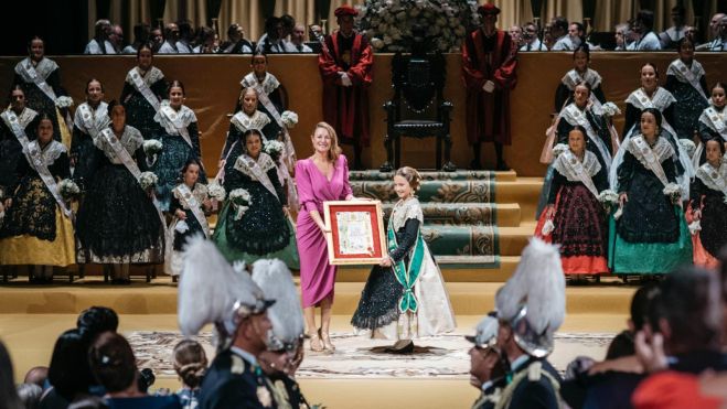 La alcaldesa le ha impuesto la banda que la acredita como máxima representante infantil, y la Banda Municipal ha interpretado la Marxa de la Ciutat. Seguidamente, la primera edil le ha hecho entrega del pergamino y el ramo. Seguidamente, la alcaldesa ha regresado al palco presidencial y la Reina Infantil de las Fiestas ha ocupado el trono, desde donde ha escuchado las palabras que le ha dirigido el Presidente de Junta de Festes, Raúl Collados.
