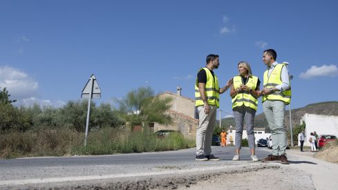 La presidenta de la institución provincial, Marta Barrachina, junto al vicepresidente y responsable del área de Infraestructuras, Héctor Folgado, y el alcalde Samuel Falomir ha visitado este jueves la actuación de mejora que se está llevando a cabo en la CV-192 y, con un presupuesto de 141.000 euros, consiste en hormigonar diversos tramos de cunetas.