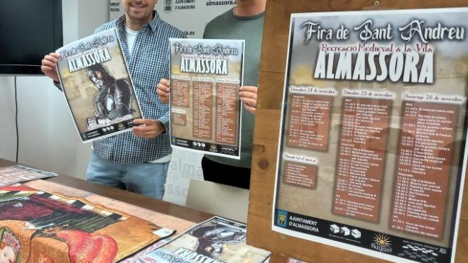 Almassora ya tiene lista una completa programación para la Fira de Sant Andreu, en el que la Vila recreará la época medieval con multitud de actividades para todos los públicos el viernes 24 de noviembre, el sábado 25 y el domingo 26. El concejal de Cultura, Vicente Blay Casino, y Álvaro Bayarri, de la empresa organizadora, han presentado los detalles de esta cita tan esperada.Este año el certamen cumple 23 ediciones convertido en una cita ineludible del calendario festivo de Almassora. La feria arrancará, a las 17.30 horas del viernes, con la apertura del mercado y el pregón de inauguración. Durante la primera jornada habrá talleres para niños, visitas guiadas, pasacalle musical, vuelos con águilas o paseo con ocas, entre otras actividades. El recinto cerrará las puertas a las 22.30 horas.El sábado, al igual que el domingo, el mercado abrirá a las 11.00 horas con numerosas recreaciones y actuaciones que permitirán al visitante revivir el Medievo en un entorno único, como la Vila de Almassora. Las paradas de artesanía, gastronomía y la música en directo tendrán especial protagonismo. La feria solo hará un descanso al mediodía, de 14.15 a 17.30 horas.En total, hay previstas cerca de medio centenar de actividades y más de 50 paradas. La Vila artesana, el área infantil, la halconería, la granja de animales, el campamento de época, las herramientas de cultivo y la cámara de torturas tendrán siempre un espacio abierto en el horario de la feria.El concejal de Cultura ha animado a todos los almassorins y a vecinos de los municipios cercanos a disfrutar de esta feria que ya es toda una tradición instaurada en la localidad. “Hemos intentado diseñar un programa de actividades para toda la familia, en la que tanto los más mayores como los más pequeños encuentren su espacio y disfruten”, ha explicado el concejal.Por su parte, Bayarri ha explicado que este año se incrementarán las actividades infantiles en la plaza Mayor, mientras que se potenciará la presencia de animales en la plaza de la Iglesia, además se ha renovado la oferta en artesanía y gastronomía, así como todos los aspectos de la teatralización.La feria también tendrá un apartado destinado a asociaciones y oenegés de la localidad.