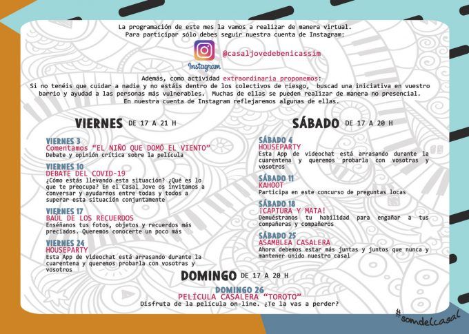 El Casal Jove de Benicàssim continúa con su programación mensual pero la ha trasladado a su perfil de Instagram para que así los jóvenes, todos desde sus casas, puedan participar en las diferentes actividades programadas. Para el mes de abril se han programado actividades los viernes y sábado en horario de tarde, a partir de las 16 horas, y el último domingo de mes.Un debate y opinión crítica sobre la película “El niño que domó el viento” abrirá la programación el viernes 3y el sábado 4 será el turno de la App de videochat “Houseparty”, la cual durante estos días de confinamiento está siendo muy utilizada. Siguiendo con el tema por el que la ciudadanía debe permanecer en sus casas, para evitar la propagación del COVID-19, el viernes 10 tendrá lugar un debate sobre el coronavirus y los participantes podrán conversar y ayudarse mutuamente en los asuntos que más les preocupa de esta crisis sanitaria. El sábado 11 los jóvenes tendrán la oportunidad de participar en el concurso de preguntas Kahoot y el viernes 17 será el día para echar la vista atrás y a través de la actividad “Baúl de los Recuerdos”, los participantes podrán mostrar desde sus casas fotos, objetos y recuerdos más preciados. El sábado 18 seguirán los juegos, en este caso uno relacionado con el engaño bajo el título “¡Captura y Mata!”. Para finalizar el mes de abril, el viernes 24 se volverá a programar un videochat con la App Houseparty, el sábado 25 se celebrará la habitual asamblea casalera y, por último, el domingo 26, los jóvenes podrán disfrutar de la película online “Toroto”. Todos los interesados en participar en la programación simplemente tienen que seguir la cuenta de Instagram @casaljovedebenicassim y, como han añadido desde el Casal Jove, “la participación está abierta a todos los jóvenes, sean o no usuarios del casal”. Además de la programación prevista, el Casal Jove propone una actividad extraordinaria consistente en buscar iniciativas que se pueden realizar de manera no presencial y cuyo objetivo sea el ayudar a las personas más vulnerables. Las ideas aportadas se subirán a la cuenta de Instagram. La concejala de Juventud, Vanessa Batalla, ha comentado que “todos tenemos que ser responsables y quedarnos en casa y por ello se hace necesario que el Casal Jove continúe con su actividad para que los jóvenes puedan tener más actividades con las que ocupar su mente y hacer mucho más ameno su confinamiento”.