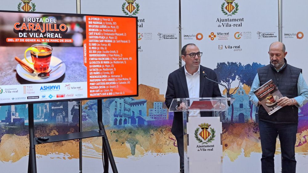 El carajillo refuerza su presencia en Vila-real. El Ayuntamiento ha presentado este viernes una nueva propuesta gastronómica con la que impulsar el sector de la hostelería y el ocio local de la mano de este producto. En esta ocasión, el carajillo, una elaboración tradicional que se ha popularizado en los últimos años y que cada día cuenta con más adeptos, tendrá su propia ruta, tal y como ha presentado el concejal de Comercio y Hostelería, Xus Madrigal, y el presidente de la Asociación de Hostelería y Ocio de Vila-real, Emilio Miralles, que se desarrollará del 27 de enero al 16 de marzo de 2025 y en la que participan un total de 22 bares y restaurantes de la ciudad.
