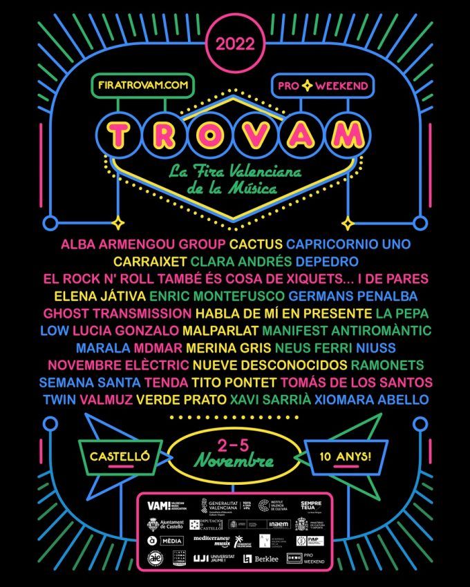 Este año, más de 40 artistas presentarán sus proyectos en diferentes escenarios de la capital de la Plana Alta. La mayor parte de las actuaciones se desarrollarán en las diversas salas y espacios del Auditorio y Palacio de Congresos de Castelló.Sin embargo, la actividad musical también se trasladará al Teatro Principal, al Paraninfo de la Universitat Jaume I (UJI) y al Templete y al Paseo de las Artes del Parque Ribalta, donde tendrán lugar las 'Experiencias À Punt'.Como es habitual, el protagonismo principal recaerá sobre figuras valencianas. Son los casos de Xavi Sarrià, quien presentará su segundo trabajo en solitario, Causa; Smoking Souls, una de las principales formaciones de rock del territorio; Cactus, grupo de música urbana con melodías bailables y ritmos frescos; Tesa, rapera que fusiona el hip hop con ritmos tradicionales; y Tito Pontet, conjunto que combina los ritmos latinos y jamaicanos.La música de raíz valenciana siempre ha formado parte de la programación de la Fira. En esta edición, Castelló acogerá al histórico grupo Carraixet. Las novedades seguirán con Marala, trío que ha investigado sobre la muerte desde varias vertientes en el disco Jota de morir.En la Fira también se representarán varios montajes escénicos donde la música es protagonista. Por ejemplo, se podrá ver la electro-ópera Manifest antiromàntic, firmada por los polifacéticos Pau Berga y Joan Palomares.Asimismo, habrá dos espectáculos para el público familiar: El rock & roll también es cosa de niños, donde se repasa la historia del género con una banda encabezada por el cantante y guitarrista Miguel Ángel Escorcia (Los Swinguers, Cat Club); y Flipa, título del último trabajo de Ramonets, donde hacen un llamamiento al optimismo, a aprender y a bailar.El cartel del Trovam también se nutre con propuestas llegadas de fuera de la Comunitat Valenciana. En la décima edición de la Fira actuaran DePedro, Máquina de Piedad, Enric Montefusco, Maria Hein, Habla de mí en presente, Chill Mafia, y La Ludwig Band.En la capital de la Plana Alta también estarán Alba Armengou; b1n0; Ernest Crusats; Las Dianas; Lucía Gonzalo; Maruja Limón; MDMAR; Merina Gris; Muerdo; Verde Prato; y Vic Mirallas.