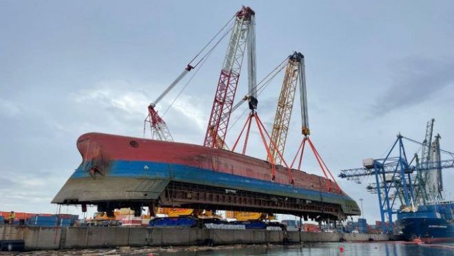 La empresa encargada de la remoción del buque Nazmiye Ana, que se hundió el pasado 28 de mayo en el muelle del Centenario del Puerto de Castelló, ha iniciado esta mañana los trabajos de extracción del barco, y ha concluido con éxito la operación de izado, traslación y depósito del barco en tierra.La operación para la remoción del buque ha dado comienzo a las 8 de la mañana, momento en el que el puerto de Castellón ha cerrado el tráfico marítimo para garantizar la seguridad de la operativa. El tráfico se ha restablecido alrededor de las 12 del mediodía, una vez el barco ha superado la zona de agua.La operativa para el izado del pecio, de 780 toneladas, ha estado compuesta por 25 personas, una grúa telescópica de 500 toneladas conectada al barco, y dos grúas posicionadas en el muelle de 460 toneladas cada una de ellas capaces de levantar en conjunto un peso total de 1.200 toneladas.El desarrollo del operativo ha conllevado unos trabajos previos, tales como un estudio geológico-geotécnico para estimar la capacidad portante del terreno bajo el muelle y la repartición de carga mediante dos carreteras de arena compactada y madera para distribuir el peso generado por el buque y las grúas.Para el izado del buque se han dispuesto los puntos especiales que se han soldado a los costados del barco para permitir el levantamiento mediante eslingas conectadas a esos puntos. Una vez izado el barco, se ha dejado que drene todo el agua para aligerarlo de peso y proceder a su traslado a tierra.El buque Nazmiye Ana se encuentra ya depositado en el muelle del Centenario, a unos 50 metros del cantil, sobre un área específica para su desguace.Hay que recordar que el Nazmiye Ana fue desplazado 150 metros lateralmente al muelle del Centenario del puerto de Castellón el pasado 22 de junio para facilitar la búsqueda de David, el estibador desaparecido en el accidente. Una operación de rescate que se está llevando a cabo de manera ininterrumpida desde entonces por parte del grupo Especial de Actividades Subacuáticas de la Guardia Civil conjuntamente con los buzos de la empresa que ejecuta el plan de remoción.